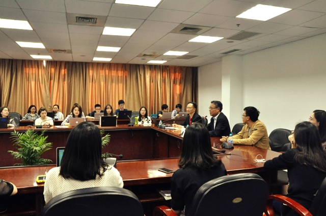 讲座开始前,丛树海书记与姜锋书记会面交谈,姚玲珍副校长,研究生院徐龙炳常务副院长一同出席。丛树海书记向姜锋书记介绍了我校国际组织人才培养项目的基本情况,双方均表示未来希望发挥各自的优势,通过合作共同培养国际组织人才。