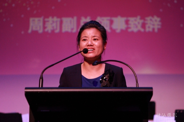 中华人民共和国驻布里斯班总领馆周莉代总领事亲自出席了颁奖典礼、她宣读了赵永琛总领事的贺词并发表了热情洋溢的讲话,高度赞扬了这次活动,她说,由上海财经大学澳大利亚校友会与澳大利亚赣商联合会、澳中投资贸易促进会、澳中财经论坛、澳大利亚江西同乡联谊会联合举办的这次摄影展览,宣传了“一带一路”,增进了澳中两国之间的交流和了解。为促进中澳两国之间的友谊和发展作出了贡献。这次摄影展充分展示了澳中两国间的政策沟通、设施联通、贸易畅通、金融融通、民心相通和睦邻友好。她对活动的成功表示祝贺,黄瀚领事、张超领事也出席了典礼。