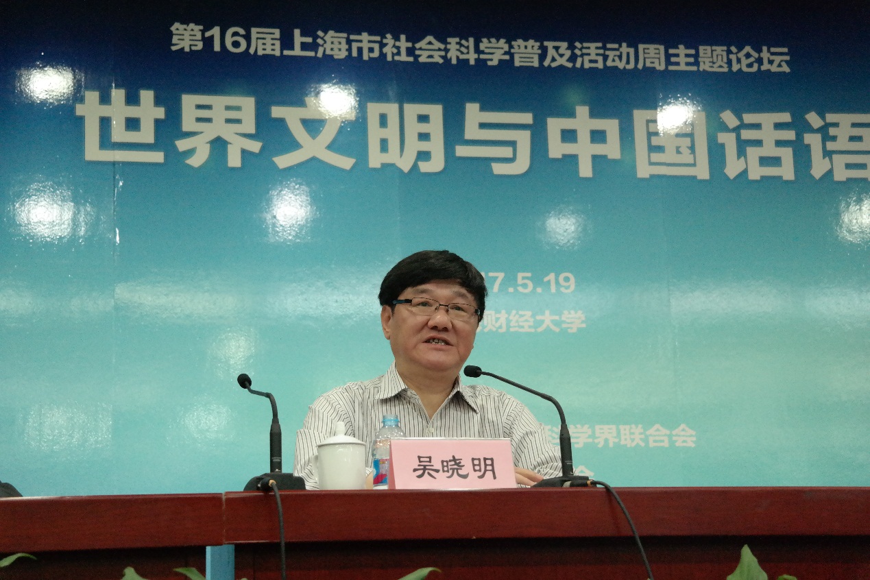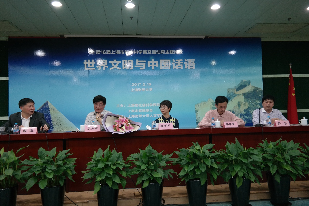 5月19日下午,由上海市社会科学界联合会、上海市哲学学会主办、上海财经大学人文学院承办的“第16届上海市社会科学普及活动周主题论坛——世界文明与中国话语”在上海财经大学行政楼一楼报告厅举行,会议由上海财经大学人文学院副院长郝云教授主持,上海市哲学学会会长、复旦大学教授吴晓明和全国经济哲学研究会会长、上海财经大学张雄教授分别做主旨演讲。上海市哲学学会副会长兼秘书长李家珉教授、上海市社会科学界联合会科普工作处副处长姚丽莎女士出席了论坛。