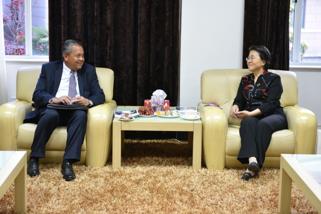 讲座开始前,我校原副校长、现国际化发展专家顾问黄颖与佩里先生和宁乔恩女士进行了亲切友好的会谈,国际文化交流学院院长孙冰、书记王玲陪同。
