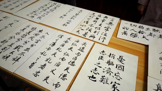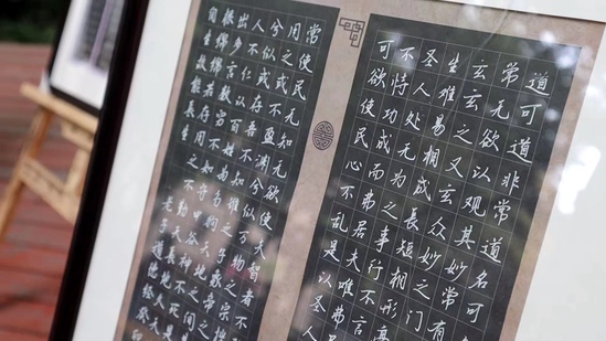 紧接着,现场霖泉书画社社友们登台,展纸挥毫,以笔墨为载体,带来“高山流水”书法展演,在古曲《水流》伴奏之中,书写了“立身以立学为先,立学以读书为本”“经典阅读”等语句,将中华传统文化的诗书读融为一体,令人赞叹。