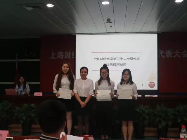 大会随后听取并审议了由第三十一届研究生会副主席刘航宇所作的《上海财经大学第三十二次研究生代表大会提案工作报告》,报告从教务教学、设施建设、后勤保障和学生自我发展四个方面,详细介绍了本次提案工作的所有已立提案内容及建议,以及相应部门的反馈,三位代表的优秀提案也在现场进行了分享交流,并获得颁奖。