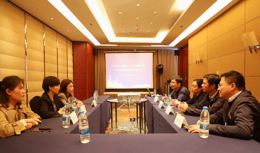 杭州市上城区人力资源和社会保障局副局长桑丽概述了上城区的基本情况以及与上海和高校的合作渊源。上城区总部经济与金融产业发达,金融业在上城区的收入占比高、人才需求大。上城区在名校大学生人才培养、见习实践、就业创业等环节均有形式多样的政府扶持政策及成熟运作项目,与高校合作切入点颇多。同时,省、市、区人才政策叠加,可为毕业生安居乐业提供多重保障。上城区团委副书记郑斐尹介绍了校、团合作暑期实践项目,期待上财学子能够通过暑期项目走进上城、了解杭州、留在浙江。此外,双方还就选调生、青年储备人才等重点专项达成多项共识与合作意向。