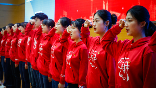 之后,上财小叶子们共同用最真诚、最响亮的青春之声庄严宣誓,表达他们践行志愿者精神,全心为进博奉献的信心与决心。“向前进,博青春,为进博,一起来”,声声宣誓响彻会场,传达了志愿者们必将践行志愿精神,全心全意为进博奉献的决心。