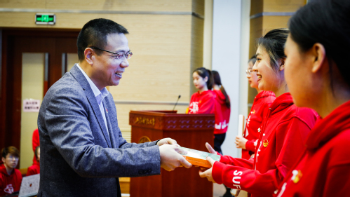 宣誓完毕,常务副校长徐飞和校党委副书记朱鸣雄为志愿者代表授旗并宣布出征。旗帜鲜红,与旗帜一般鲜艳的还有志愿者们满腔的热情;当校旗和队旗在空中飘扬,与它们一起飞扬的更有志愿者们共同努力、为进博会奉献的精神。