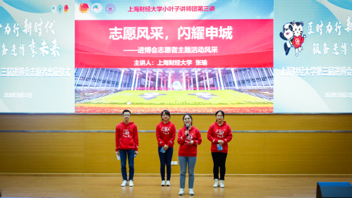 服务进博,匡时力行。仪式邀请上海财经大学“小叶子讲师团”小老师们到出征现场,分享自己的进博故事和记忆,帮助新晋志愿者们了解自己的职责与任务,在进博会上更好服务他人,展现自我,汲取知识,开拓眼界。据了解,校团委在第三届进博会倒计时100天时,招募往届进博会优秀志愿者代表,组成“小叶子讲师团”,打磨了5场精品课程,目前已面向本届志愿者们开展了培训工作。