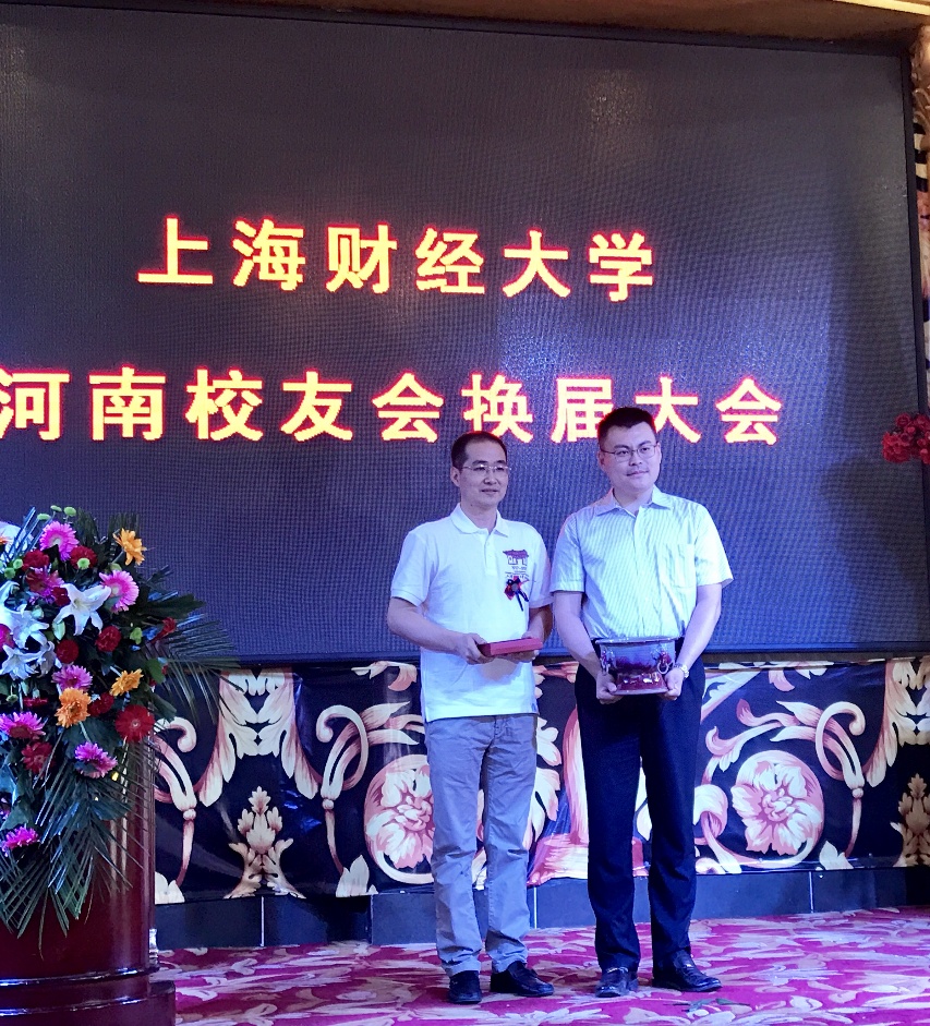 接着,上海财大优秀生源基地签约中学——河南太康一高的沈世弘校长代表发言,北京校友会会长杨青先生、中南财大河南校友会秘书长朱学梁、河南财大校友会办公室主任杨伯坚依次上台发言,纷纷以各自的形式对河南校友会的换届表示祝贺并赠送了纪念品。