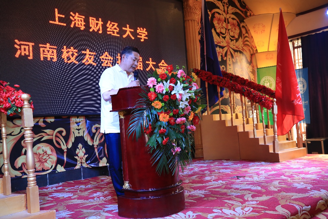 在上海财经大学建校百年校庆来临之际,6月3日,上海财经大学河南校友会换届大会在河南郑州顺利召开。上海财经大学副校长、校友总会秘书长方华,继续教育学院党总支书记、校友总会副秘书长张彦波,校合作发展处副处长杨擎宇、副处长王峰,统计与管理学院党委副书记王体出席会议。上财北京校友会、安徽校友会、江苏校友会、浙江校友会、公管校友会、固定收益俱乐部等兄弟校友会代表,以及中南财经政法大学河南校友会、东北财经大学河南校友会、河南财经政法大学等兄弟高校代表亲临现场祝贺。上海财经大学河南校友会成员和各界代表嘉宾一百余人齐聚一堂,共同见证这一美好时刻。
