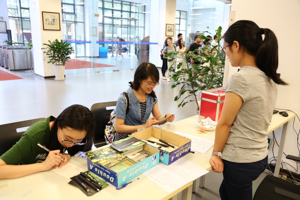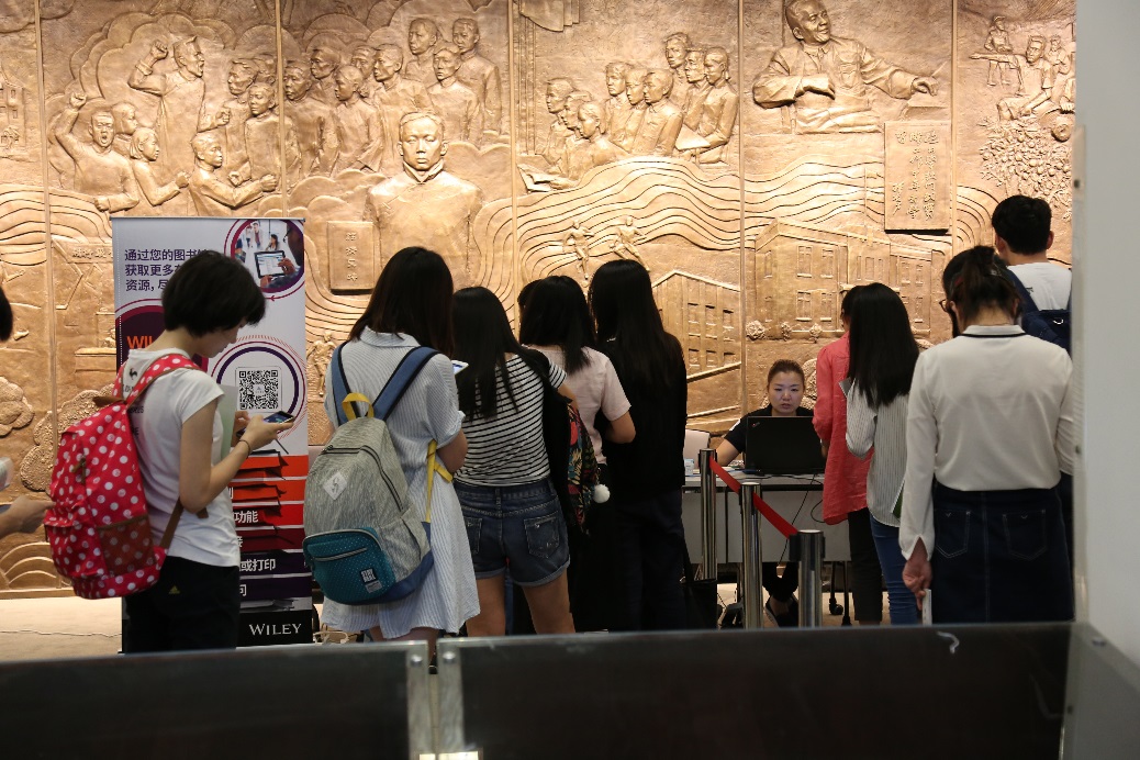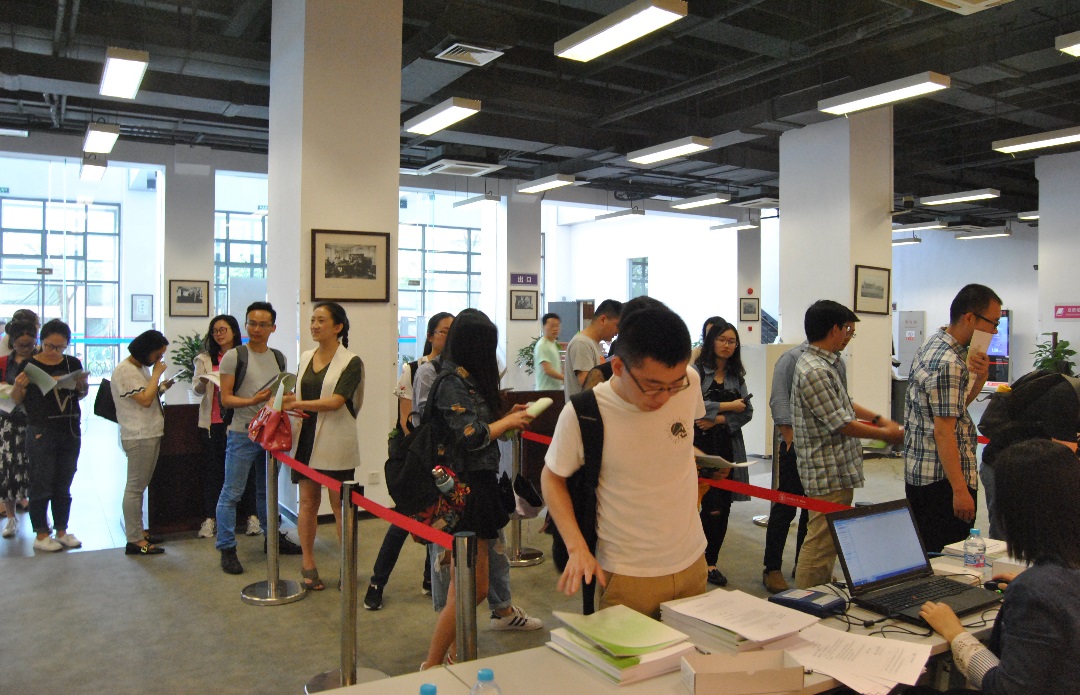 当天,整个图书馆大厅一直熙熙攘攘,距离活动开始还有一小时,就已经有不少师生前来等候。办理上图读者证的师生排成了两条长龙,6位工作人员连续作业5.5个小时,为近千名师生提供了办卡和咨询服务。下午3点半,上图工作人员带来的750余张读者证全部办理完毕,平均每分钟办理一张。