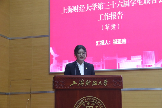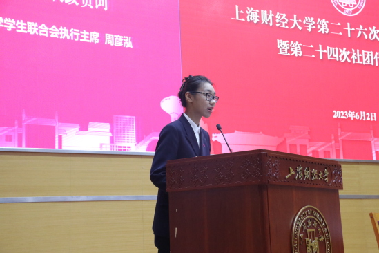 6月2日下午,上海财经大学第二十六次学生代表大会暨第二十四次社团代表大会在创业中心一楼报告厅顺利举行。校党委副书记朱鸣雄老师出席大会并讲话,来自党委校长办公室、党委学工研工部、保卫部、工会、团委、教务处、招生就业处、学生工作处、合作发展处、后勤管理处以图书馆、网络与信息技术中心、医疗健康服务中心、后勤实业发展中心等部门的负责人以及各学院党委副书记、分团委书记、兄弟高校学生会的学生代表们,共同出席了本次大会。
