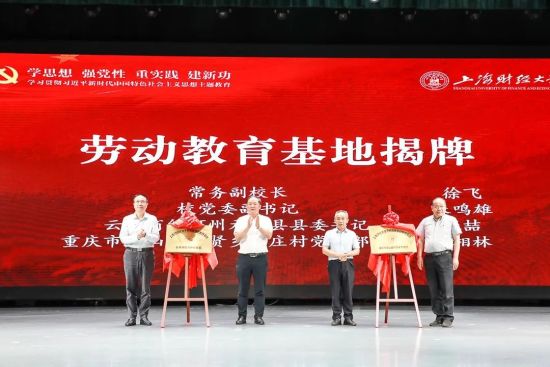 常务副校长徐飞、校党委副书记朱鸣雄、云南省红河州元阳县县委书记张喆和下庄村党支部书记毛相林共同为千村调查劳动教育基地揭牌。