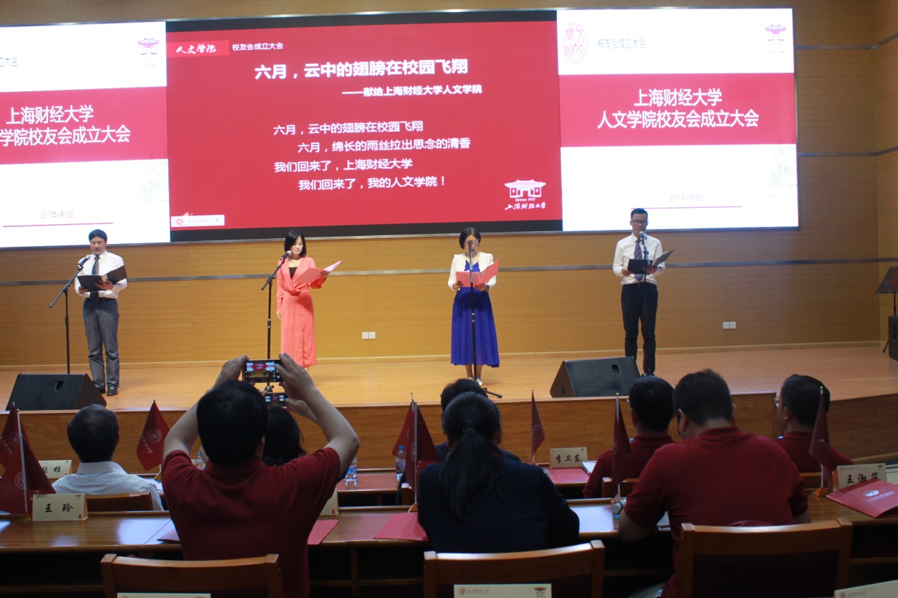 十年树木,百年树人,莘莘学子对母校有割舍不了的情谊。人文学院2008级博士生袁兴金、2014级博士生申唯正以及两位特邀嘉宾,中国作协会员、上海市作协理事杨绣丽和独立财经评论员焦红梅等四人,共同表演了由袁兴金等校友原创的诗朗诵《六月,云中的翅膀在校园飞翔——献给上海财经大学人文学院》,赢得全场阵阵掌声。
