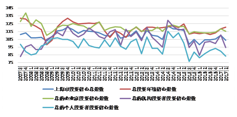 上海财经大学应用统计研究中心和上海社会调查研究中心上财分中心对上海市企业领导人或企业家、机构投资者和个人投资者的调查结果显示,2017年第二季度上海财经大学上海市投资者信心指数为103.65点,环比下降6.60点,同比基本持平。指数虽有所回落,仍位于乐观区域,表明上海市投资者心态仍较为积极。