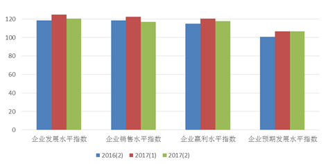 上海市企业家投资信心指数反映了企业家对于本企业生产经营现状的满意程度和对未来的预期。2017年第二季度上海市企业家投资信心指数为115.47点,环比下降3.12点,同比上升2.27点。本季度企业家投资信心指数的分类指数整体与上季度相比呈下降态势,其中表现当前企业发展状况的企业发展水平信心指数为120.60点,与上季度比下降4.4点,同比上升2.30点;反映企业销售水平的企业销售水平信心指数是为116.95点,环比下降5.30点,同比下降1.72点;企业盈利水平信心指数为117.58点,环比下降2.74点,同比上升2.53点。企业预期发展水平信心指数为106.73点,与前一季度基本持平,同比上升5.98点,见图4。