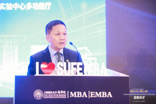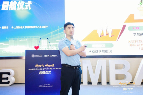 在学业导航环节,上海财经大学商学院 MBA 中心执行主任徐松伟为新生详细解读了2023级培养体系和学业规划,培养体系将全方位提升学生职场核心竞争力,助力职业发展,帮助学生成长为长期活跃在行业前沿,勇于开拓创新,不断在更高维度的层次实现职业和人生双重理想的商界精英。他勉励同学们入校后要大胆探索,加速成长,与各行各业的商业英才们携手共进,奔赴未来。