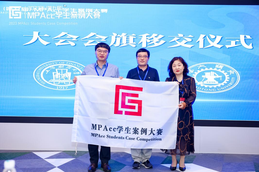 会旗移交仪式上,上海财经大学会计学院院长靳庆鲁将象征大赛旗帜交还给全国会计专业学位研究生教育指导委员会秘书长支晓强,支晓强转交给大赛下一届承办方西安交通大学管理学院会计与财务系副系主任欧佩玉。
