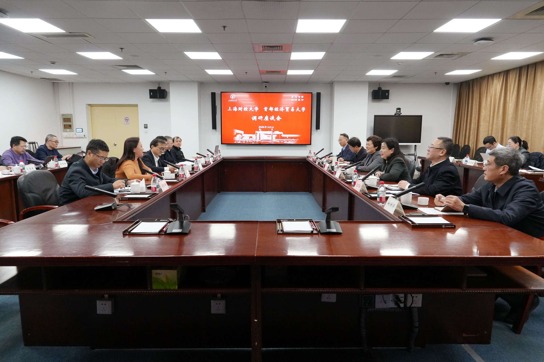 1月6日下午,首都经济贸易大学党政领导刘颖、徐芳、欧阳沁、毛百战、尹志超、姚林修一行来访我校,双方围绕“十五五”规划编制、学科交叉融合、人才培养模式创新等方面议题展开深入交流。我校校长刘元春,党委副书记、纪委书记何鹏程,党委副书记周国良,校长助理、教务处处长夏纪军参加会议,副校长刘莉亚主持座谈会。会上,刘元春校长首先对首都经济贸易大学一行表示热烈欢迎。刘校长简要介绍了我校1917年建校以来的悠久历史、进入新世纪率先推进成建制引进海归人才的国际化改革成效,围绕“财经红利退潮后何去何从”提出“上财四问”,重点阐述了以数智新财经为核心的四大学部布局及学科建设亮点。刘颖书记对上财的热情接待和倾囊相授表