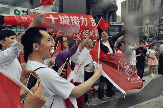 上财助威团也成为众多途径运动员的精神补给站,更有“上财美妈”前来相认,她的女儿正在上财就读,内心掩饰不住的自豪感都展现在她灿烂的笑容中。助威团的助威宣传阵势引得不少参赛运动员拍照,还有学校的“仰慕者”特地在助威团的校旗前合影留念,让人不得不感叹上海财经大学近年来直线上升的魅力值和影响力。