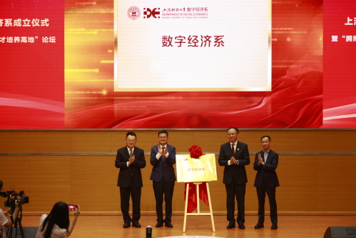随后,上海市人民政府副秘书长王平,上海财经大学党委书记许涛,阿里巴巴集团董事会主席兼首席执行官、阿里云智能集团董事长兼首席执行官张勇,上海市教育委员会主任周亚明共同为上海财经大学数字经济系揭牌。