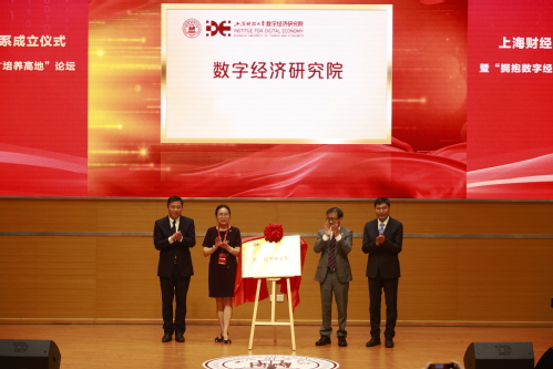 杨浦区委副书记、代区长周海鹰,上海财经大学校长刘元春,阿里巴巴集团副总裁、阿里研究院院长高红冰,上海财经大学原副校长、数字经济系筹备组负责人刘兰娟共同为上海财经大学数字经济研究院揭牌。