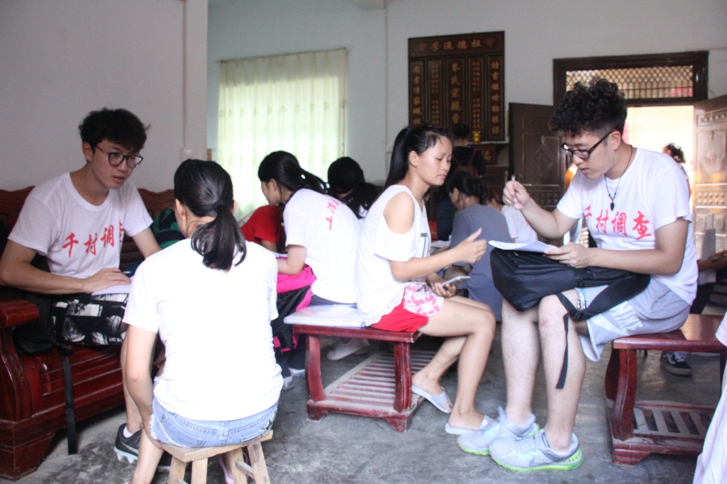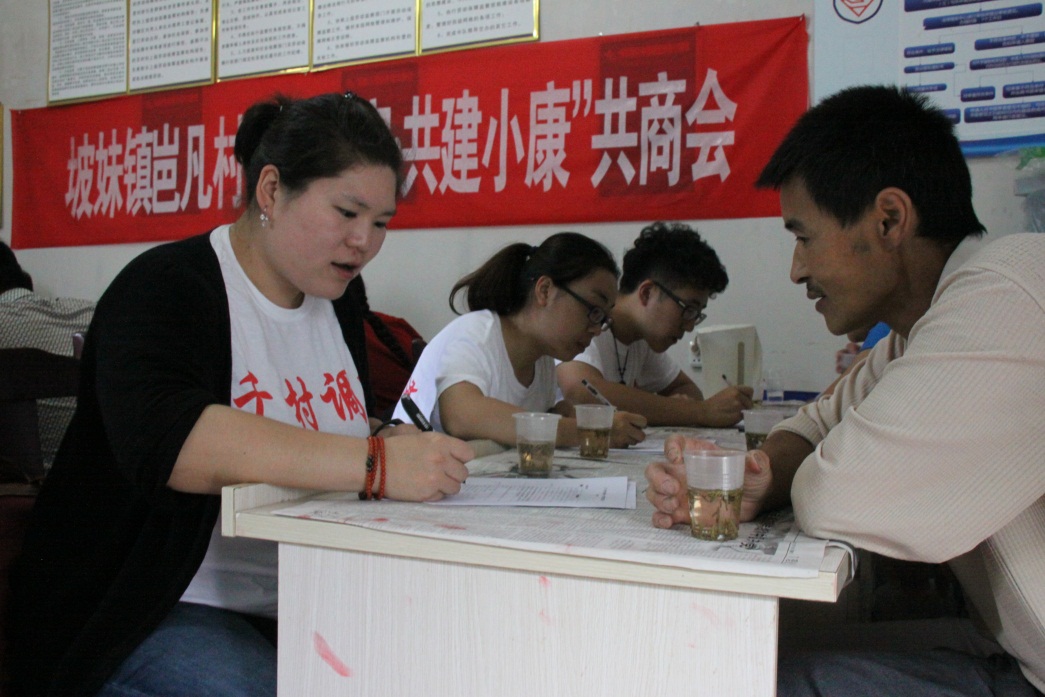 7月12日,调查小组冒雨来到坡妹镇的岜凡村。在村干部的帮助下,就在村委会开展问卷调查。由于场地有限,不大的会议室里挤满了人,你来我往的声音一浪盖过一浪,调查小组成员虽然声音已经沙哑,但依然耐心地询问着村民问题,顺利完成调研任务。