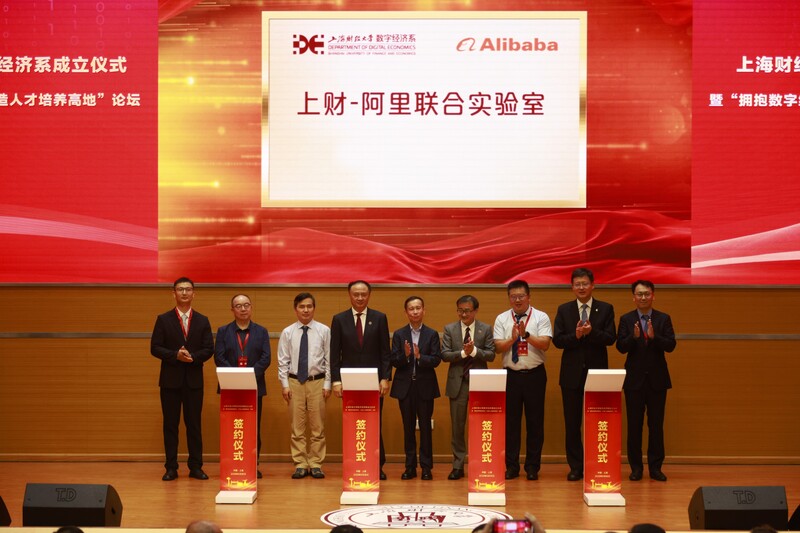 揭牌仪式结束后,阿里巴巴集团、阿里云智能集团、淘天集团与上海财经大学数字经济系签署全面合作协议,并宣布成立上财-阿里联合实验室。世纪互联集团有限公司、海通证券股份有限公司、上海欧冶金诚信息服务股份有限公司、安永(中国)企业咨询有限公司与格尔软件股份有限公司也与上海财经大学数字经济系签署了校企合作协议。
