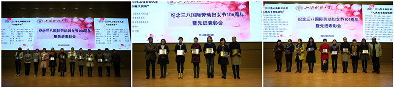 颁奖过程中,获得表彰的个人和集体代表纷纷发表感言,分享了她们学习工作、团队建设、家庭生活等方面的收获和感悟,以及对学校、同事及家人的感谢。会上先后颁发了市、校两级巾帼系列先进个人和集体、比翼双飞模范佳侣、妇女小家等奖项,共有41位个人、22个集体、12对夫妇受到表彰。法学院国际法教研室荣获上海市巾帼文明岗,学术期刊编辑部陆蓉荣获上海市教育系统巾帼建功标兵,国际文化交流学院荣获上海市教育系统巾帼文明岗,信息化办公室陈云、同济大学中德工程学院陈明夫妇荣获上海市教育系统比翼双飞模范佳侣标兵,图书馆妇女小家荣获上海市教育系统优秀妇女小家。