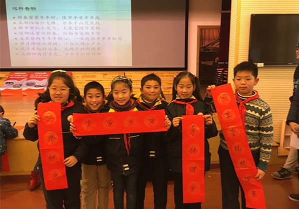 外国语学院志愿者“公益生日”活动中组织孩子们书写的春联