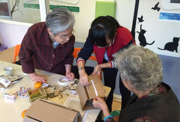 统计与管理学院“进社区”志愿者与老人一起做手工制品