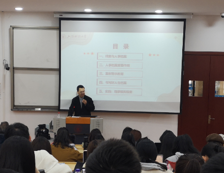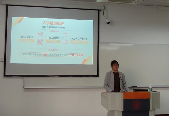 “档案诚信教育”主题课程主要是引导学生深刻体悟人事档案所蕴含的诚信价值,用真实的人事档案书写人生档案的“纯度”、“亮度”和“厚度”,进而更深入地体会诚信价值观的重要性,更好地发挥社会主义核心价值观的引领作用。在课堂上,四位老师充分发挥各自的专业知识特长,为学生全面讲解了人事档案的基本知识、重要作用、管理要求以及转递办法等内容,重点阐述了人事档案所蕴含的诚信价值。