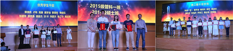 在颁奖环节,刘兰娟副校长为学院团委颁发2015年上海市五四红旗团委奖,并为葛冬冬、邓祖新、张雪凤、井然哲等4位老师分别颁发首届学院科研奖、研究生教学奖、本科生教学奖、服务奖。学院党总支书记王淑范颁发首届院歌大赛的最佳人气奖、最具特色奖、最佳风采奖。学院常务副院长黄海量、副院长韩冬梅颁发第二届十佳优秀学导奖。院党总支副书记周巧颁发学院文体活动获奖;院副院长葛冬冬颁发优秀指导老师和学科竞赛奖;院长助理曾庆丰颁发大学生创新创业优秀项目奖;学院教师代表为学生先进集体及个人颁发了荣誉证书。