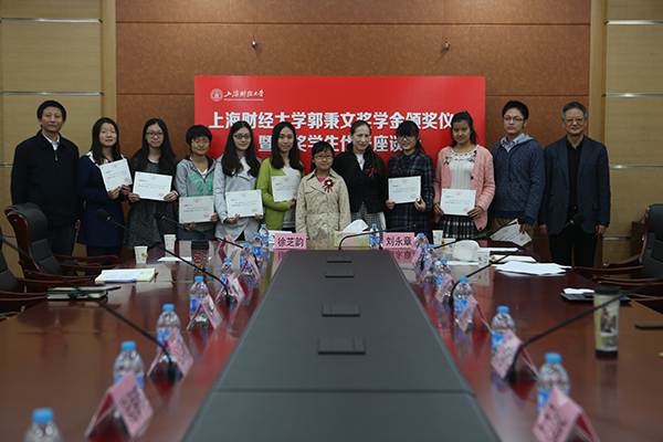 颁奖仪式上,校党委副书记刘永章对徐芝韵女士及郭秉文亲属的到来表示热烈的欢迎与感谢,对获奖同学表示祝贺。刘永章副书记表示郭秉文先生对上海财经大学的创建做出了重大贡献,郭先生的办学理念与教育思想深深地影响着财大、影响着学生。97年来,学校取得了令人瞩目的发展,为社会培养了大量人才。刘永章副书记鼓励同学们克服困难、努力学习、为国家多做贡献,不辜负社会对学校的期望和关爱。 随后,学生工作部(处)长冯润民宣读了上海财经大学2013-2014学年郭秉文奖学金获得学生名单,徐芝韵女士为获奖学生逐一颁发了荣誉证书并致辞。徐芝韵女士在致辞中谈到:在上海财经大学97周年校庆之际,我们在纪念郭秉文先生的同时,更要追思他的教育思想。作为一位教育学家,郭秉文先生立志通过教育改变世界,通过商业改变时代,强调培养学生的独立人格和自主能力,鼓励责任、自由和民主。她表示,郭秉文先生通过教育改变社会的理想在财大得到了很好的实现。 接着,获奖学生代表外国语学院2011级易桐宇同学和金融学院2011级孙世龙同学从志愿服务、社会实践和学术研究等方面与在场嘉宾和同学进行了交流与分享。易桐宇同学谈到郭秉文奖学金是对自己大学四年努力的肯定,未来更应该心系社会,放开眼界,贡献国家与社会。孙世龙同学也认为财大的学习和生活经历对自己的成长很有帮助,未来应该继续坚持经济学与社会实践相结合。