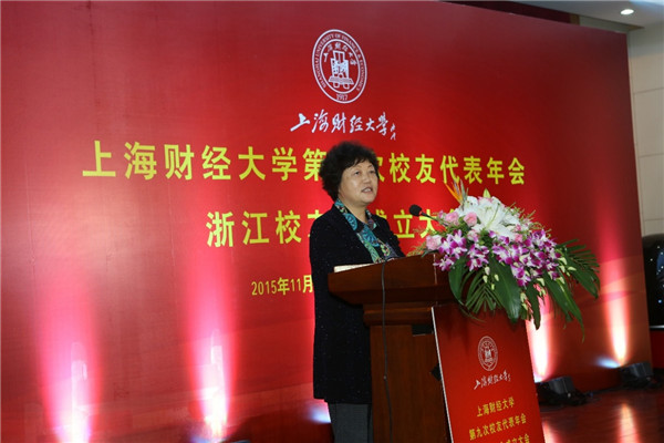 会议最后,樊丽明校长发表了热情洋溢的讲话。樊校长首先代表学校和全体上财师生员工向浙江校友会的成立表示热烈祝贺,并向为浙江校友会成立而辛勤工作的筹备组校友表示最诚挚的感谢!随后,樊校长重点从校史、校情和校友等三个方面阐述了对学校发展和校友工作的认识。樊校长指出,近年来,上海财经大学无论是从特色鲜明的财经学科建设、科学研究成果,还是放眼世界的国际化办学战略等方面都取得优异的成绩。她殷切希望浙江校友珍惜共同的学缘,不断增强凝聚力,建设好校友会组织,将校友会建设成沟通交流、分享感悟、互帮互助的平台,以及为学校发展贡献力量的载体,为校友服务,为学校服务。最后,樊校长还为所有浙江校友送上了最衷心的祝福!