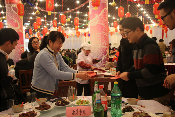校党委书记丛树海代表学校发表新春贺辞,向留校过年的学生致以新年的问候和祝福。校领导逐桌向同学们送去代表祝福的新年红包,同学们一边欣赏着校艺术团带来的精彩表演,一边品尝着温馨美味的年夜饭,畅谈一年来的收获与感悟,畅谈新的一年的计划与憧憬,感受学校大家庭的温馨和睦。