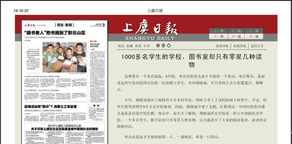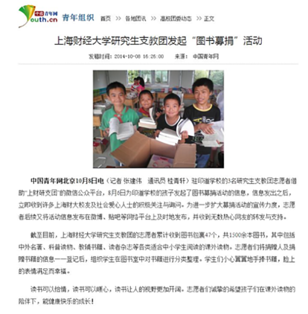 到岗后,志愿者们发现当地学校驻贵州省道真县的志愿者们自发组织了“爱心图书馆”筹建工作,驻云南孟连县的志愿者们也启动了“班级图书角”建设工作,通过网络面向上财师生和社会爱心人士发起了图书募捐活动。截至目前已收到图书5000余册,受到了当地师生的好评和多家媒体的广泛报道。