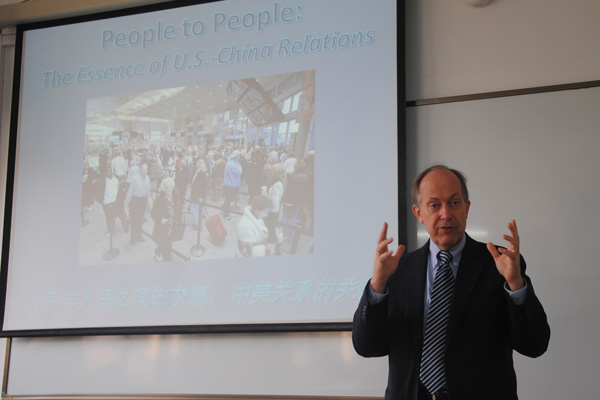 会谈后,葛瑞風总领事还与我校部分学生代表共同参加了中美合作及美国高等教育主题交流分享会,总领事从市场开放、中美贸易、教育资源共享等16个方面生动展示了中美双方广泛而深入的合作关系,并指出中美关系不断发展的关键在于加强两国人民之间的交流。活动现场,总领事流利的中文给到场学生留下了深刻的印象,同学们现场踊跃提问,与总领事进行了热烈而深入的交流。