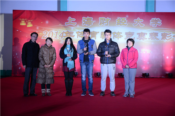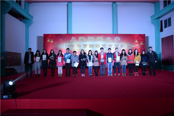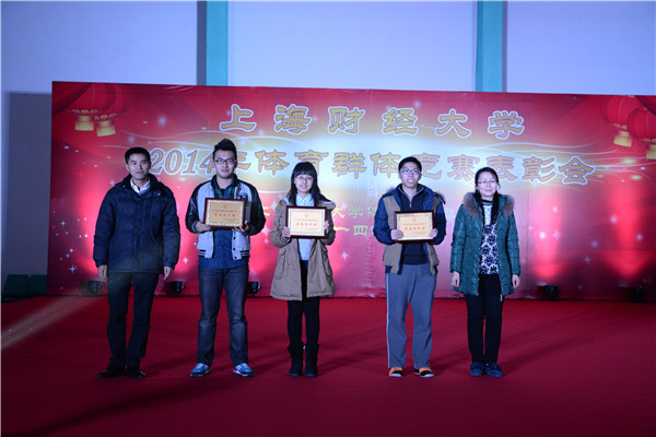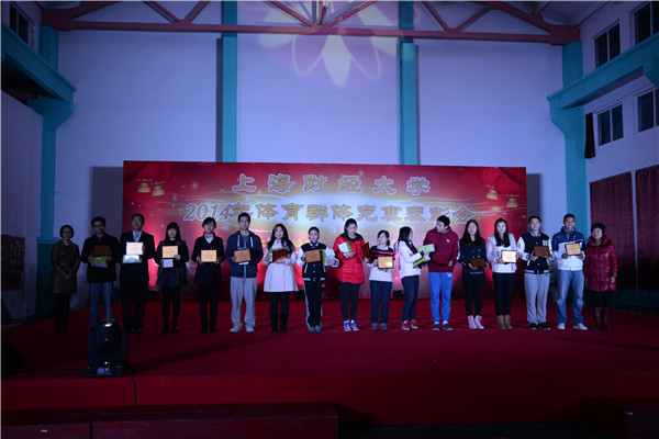 2014年12月30日,上海财经大学2014年体育群体竞赛表彰会在羽毛球馆举行,校党委副书记刘永章,两办等相关职能部门负责人,各学院党组织负责人等出席。在被炫彩灯光装饰的羽毛球馆,与各学院学生会体育部代表、体育类社团代表、专业运动队代表以及对我校2014年度体育竞赛发展做出贡献的师生,齐聚一堂欢庆盛会,回顾一年体育征程中斩获的勋章,同时展望新一年的财大体育事业发展。