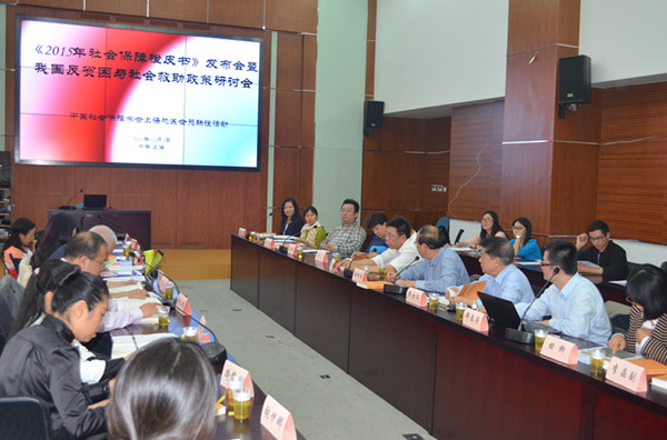 会上,上海财经大学党委书记、中国社会保障学会副会长丛树海教授首先代表中国社会保障学会和上海财经大学致词。研讨会上半场由郑春荣副教授主持,上海财经大学社会保障团队发布了《2015社会保障橙皮书——反贫困模式与管理》。社会保障橙皮书是上海财大社保团队的年度研究成果,又称国际社会保障动态,每年追踪国际社会保障改革与实践的最新动态,并选择以一主题进行深入研究。迄今橙皮书已连续三年成功出版并进行发布。本年度主编李华教授以“反贫困中的政府与社会力量”为题,介绍了橙皮书的主要研究思路、观点与贡献;写作团队中的岳崟助理教授、余央央助理教授、田柳助理教授等分别以“转型期中国的新城市贫困问题”、“我国反贫困进程与老年贫困”、“贫困人口的测度与识别”为题进行演讲,介绍研究成果。 研讨会下半场由杨翠迎教授主持,安排了六场演讲,分别是华东师范大学钟仁耀教授“支出型贫困救助的若干问题思考”;我校郭士征教授“我国老年照护救助政策”、上海交通大学章晓懿教授“上海城市贫困人口的特征分析”、华东师范大学曹艳春副教授“社会救助新理念:从低保标准到家庭运行标准的变革”、华东师范大学余飞跃副教授“贫困的致因与慈善的路径变革研究--以福特基金会为例”、上海师范大学张祖平副教授“志愿服务的扶贫价值及扶贫策略研究”。