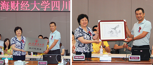 樊丽明校长代表学校向新成立的四川校友会授牌并赠送纪念品,朱川会长代表四川校友会接受“上海财经大学四川校友会”牌匾,以及由我校数学学院高洁同学手绘的“志在云天·上财雄鹰展翅图”。