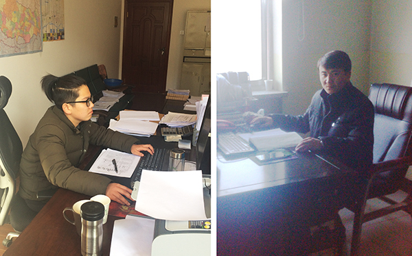 图:西部计划驻西藏志愿者左瑞(左)和驻新疆志愿者热斯巴依(右)正在工作