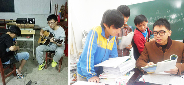 图:上财研究生支教团云南分团志愿者谭潇(左)在教学生弹吉他,贵州分团志愿者胡晓斌(右)在进行课余辅导