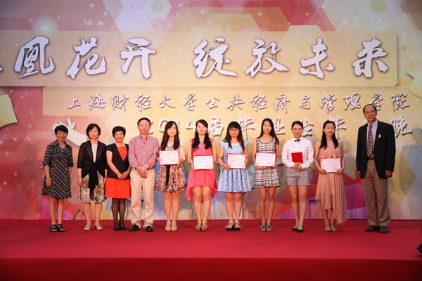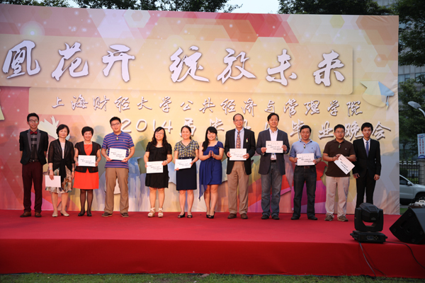 学生工作部(处)处长冯润民、公共经济与管理学院院长俞卫分别致辞,对毕业生们顺利完成学业表示祝贺,并提出殷切期望,希望2014届毕业生们秉承“厚德博学、经济匡时”的校训精神,坚定信念、胸怀宽广、积极进取,脚踏实地工作,努力追求梦想。毕业生家长代表表达了对学校和学院的感谢,勉励毕业生们要感恩老师、父母,珍惜同学友情,做一个对社会有用的人、一个信念执着、有丰富知识、优良品德、良好本领的人,并祝愿毕业生们展翅翱翔、凤凰花开。 本科毕业生和研究生毕业生代表先后发言,她们表达了对上财生活的留恋和不舍、对母校师长的感恩和祝福以及毕业生们勇担责任、回报社会的决心! 就业指导中心主任谭予絮、公共经济与管理学院院长俞卫、副院长刘小川和方芳以及税务硕士项目中心负责人杨丹芳等五位老师共同为29名2014届税务硕士毕业生颁发“上财君昌税务硕士”毕业纪念证书。 晚会揭晓了通过前期同学们在学院微信平台投票产生的公共经济与管理学院优秀师生获奖名单,并由学院第十一届团学联主席团的三名同学和学校团委书记褚华、副书记宋达飞两位老师分别为获奖师生颁奖。 学院还向热心校友工作的13名毕业生颁发了“校友联络大使”聘书。毕业生代表向学院献礼,表达了全体毕业生对学院发展的美好祝愿。 随后,丰富多彩的文艺表演、微博墙互动、热线电话等环节将晚会气氛逐渐推向高潮,晚会在校友寄语和毕业生感言中步入尾声,最后以辅导员与毕业生们共同演绎的一曲《朋友》画上圆满句号。