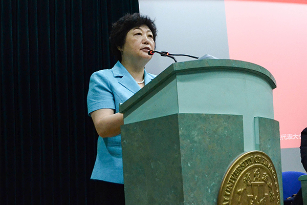 校长樊丽明讲话,她充分肯定了过去一年里学生会和社团联在学生活动组织与校园文化发展中的辛勤付出与奉献,并从两个方面对本届大会及各项报告进行了回顾响应。