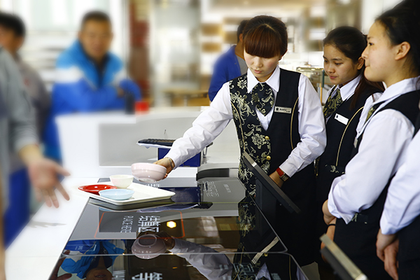 新食堂三楼提供极具特色的流水线自选餐服务,种类丰富且制作精良。“你看,这里每个窗口都有保温灯,可以控温在30到40摄氏度,这样即保证菜品好看,又可以让菜不会凉掉”,任经理特地打开窗口的保温灯向我们介绍。每个取菜窗口都配有统一着装训练有素的服务员,带给同学最佳的就餐体验。最引人注目是新式自动结账系统。不同菜品按价位摆放于两元区、三元区、五元区等,同学们可根据自己的喜好自助选择,菜品价位使用不同颜色餐盘以示区分,餐盘底部装有芯片,当同学们将托盘置于柜台结算区时,柜台设备会立即感应到各餐盘芯片并计算总价。经测试,这种智能感应系统可将结账流程缩短至1秒,大大节省了排队结账的时间。技术人员解释,柜台配有两套感应设备,即使一套设备出现故障或处于维修期,系统也能正常运行。三楼用餐区基本使用木质四人桌,桌上配有亮色桌布及玻璃,对于桌布的配置,任经理解释说因为餐厅地面颜色较暗,这样可以中和整个餐厅色调,营造温馨舒适的气氛。同时每张桌子都配备两套桌布,一周一换,以此保证桌布的整洁。整个三楼约有200个就餐座位,据任经理估计,试营业期间三楼每顿可容纳近1000人就餐,未来还将增设自助餐厅,容量可能会再度扩增。
