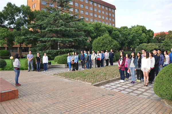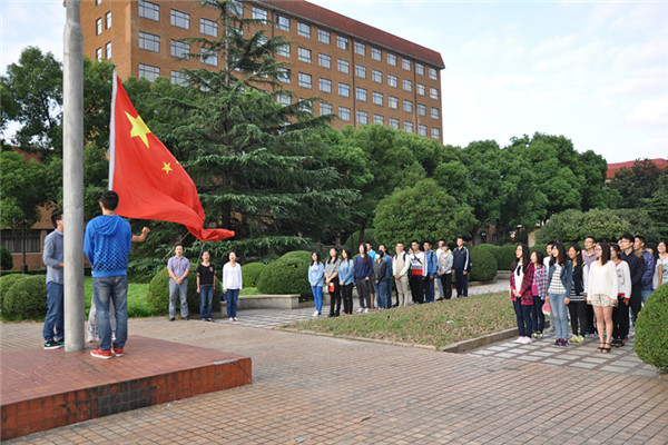 10月1日清晨,来自信息管理与工程学院、外国语学院和数学学院的40多名党员及预备党员学生代表齐聚在国定路校区正门升旗台,举行庄严的升旗仪式,拉开了本次系列主题活动的序幕。在初升太阳的照耀下,鲜艳的五星红旗伴随着嘹亮的国歌声冉冉升起,同学们集体行注目礼,表情庄严肃穆。