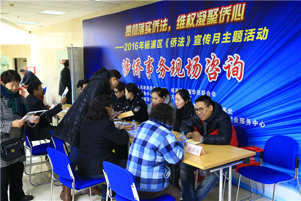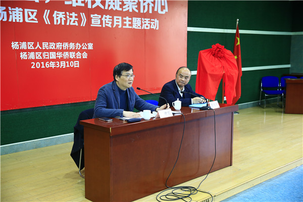 陈文佳副主任为与会的侨界人士作了《新时期国内外侨情》专题辅导讲座,并为杨浦区“侨法宣传角”宣传阵地赠送了《侨法》宣传书籍。王立新部长、陈宏副书记共同为我校“侨法宣传角”揭牌;区侨办、侨联、学校统战部和五角场街道四方联合签定了为社区内我校早期归侨结对服务共建协议。上海华侨事务中心、区侨办、区人保局、五角场街道、公安分局出入境办、区高层次人才创新创业服务中心等6个单位,根据各自工作职能为区域内华侨华人、归侨侨眷提供涉侨政策、留学人员落户政策、早期归侨民生服务、华侨华人出入境政策、“3310”海外高科技人才引进政策等现场咨询活动。