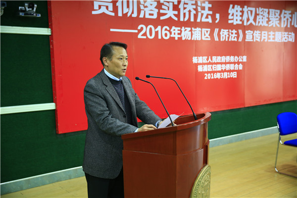3月10日,由杨浦区政府侨务办公室、杨浦区归国华侨联合会主办,上海财经大学统战部,五角场街道党工委、办事处协办的“贯彻落实侨法,维权凝聚侨心”--2016年杨浦区《侨法》宣传月主题活动在我校举行。校党委副书记陈宏,市政府侨办副主任陈文佳,区委常委、统战部部长王立新出席了本次侨法宣传活动。