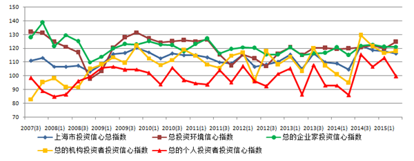 上海财经大学应用统计研究中心对上海市企业领导人或企业家、机构投资者和个人投资者的调查结果显示,2015年第二季度上海财经大学上海市投资者信心指数为116.39点,环比降低1.72点,同比上升11.74点。指数虽小幅回落但仍处于较乐观区域,表明上海市投资者心态整体积极。
