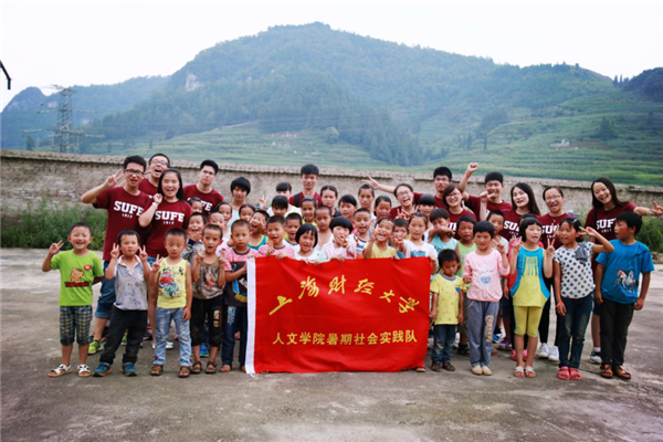 2015年7月12日到7月25日,“爱在财大”团队在贵州省普定县进行了为期两周的实践活动,为每户结对帮扶的贫困家庭亲自送去财大师生爱心善款1000元,并将从校内募捐得到的三百余册图书捐给了当地的地坝小学。社会实践主要分为支教活动、捐资走访活动以及社会调研三大块。一方面通过募捐得到到的善款为贫困儿童们提供经济支持,另一方面通过支教走访,为孩子们提供心理疏导,开拓孩子们的眼界,也帮助家长意识到教育的重要性。
