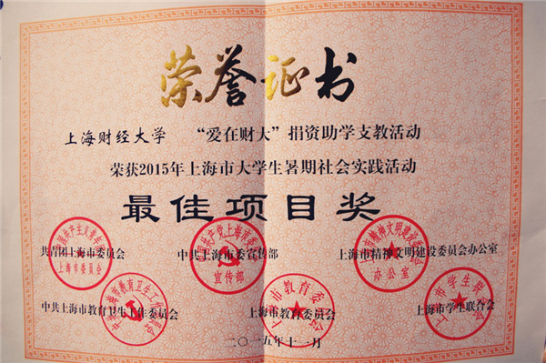 此外,我校会计学院“‘励志之旅’扶贫帮困项目”,金融学院 “阅读伴我成长五期——2015年暑期金融学院阅读主题支教服务”,统计与管理学院“灵动青春——凉山支教项目”、“寻根溯源·薪火相传——关于贵州遵义红色文化传承的调研和实践之旅”,数学学院“黔梦南行——上财贵州支教项目”、“‘圆梦连心’义务支教实践活动”荣获优秀项目奖。